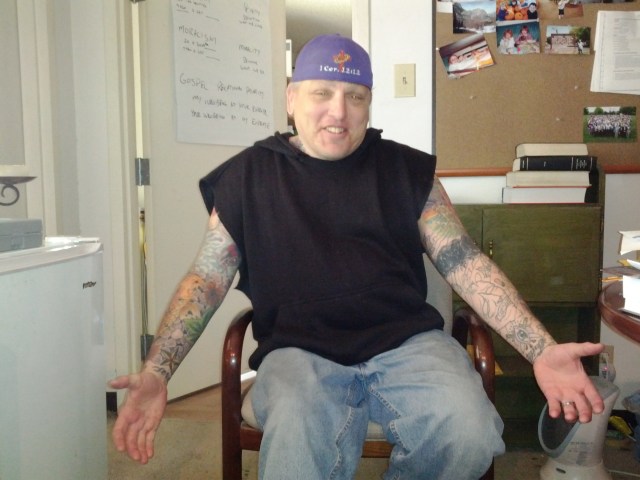 This week ThinkChristian.net will post a piece I wrote on tattoos. I was a bit surprised to get the assignment from Josh (the editor) because I don’t really know much about them. I had to do a bit of research and God blessed me with Brandon who volunteers at Living Stones. Brandon has the most and best ink I’ve ever seen and his story is as colorful as his skin. One of the reasons he tells me for being so inked up is the he grew up among a lot of Mexicans and he was tired of being so white, so now he’s colored.