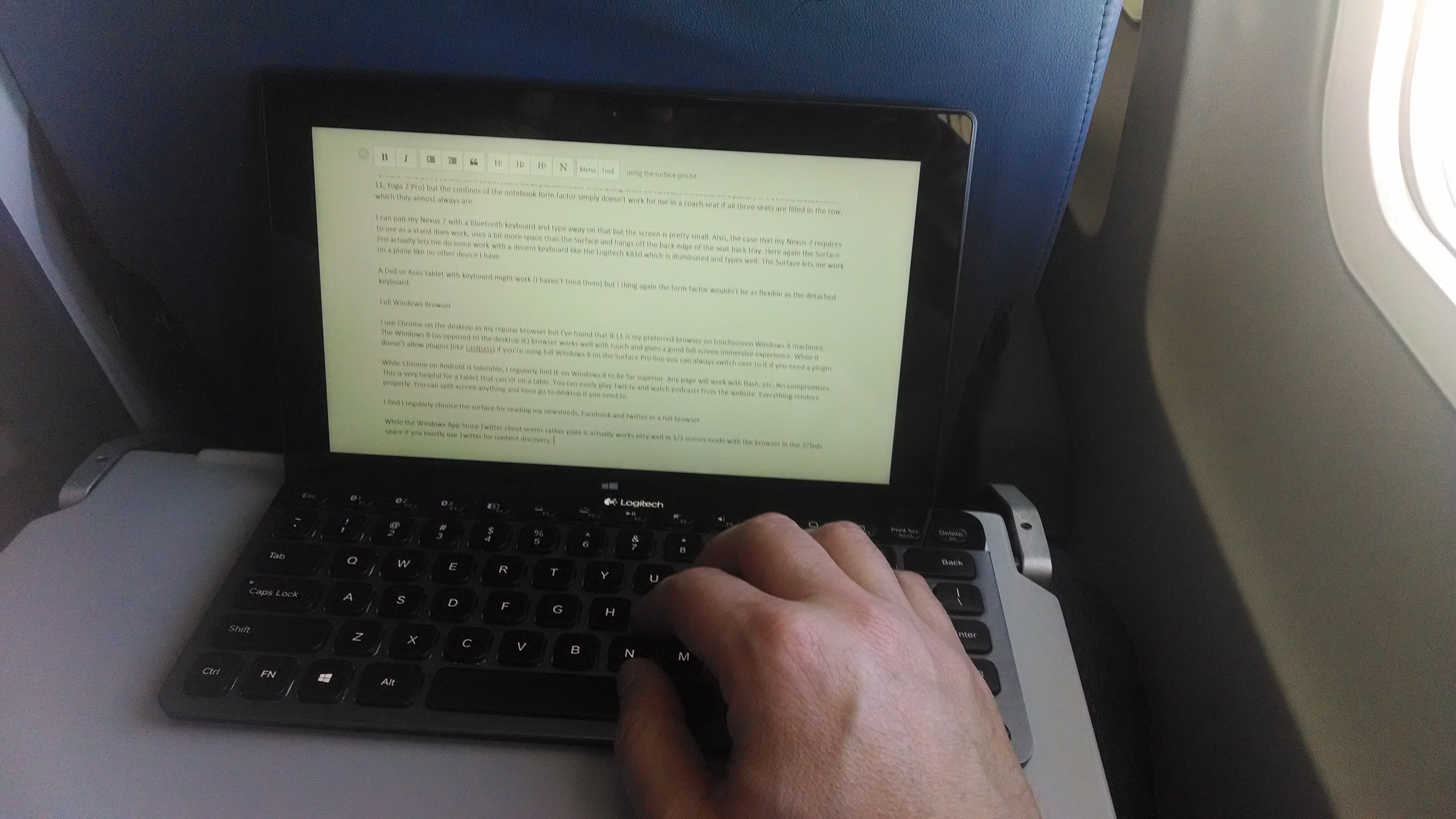 I am 6’5″ and don’t fit well into coach seats on airplanes. I have tried doing work on various notebooks on a plane (HP Pavilion, MacBook Air 11, Yoga 2 Pro) but the confines of the notebook form factor simply doesn’t work for me in a coach seat if all three seats are filled in the row, which they almost always are.