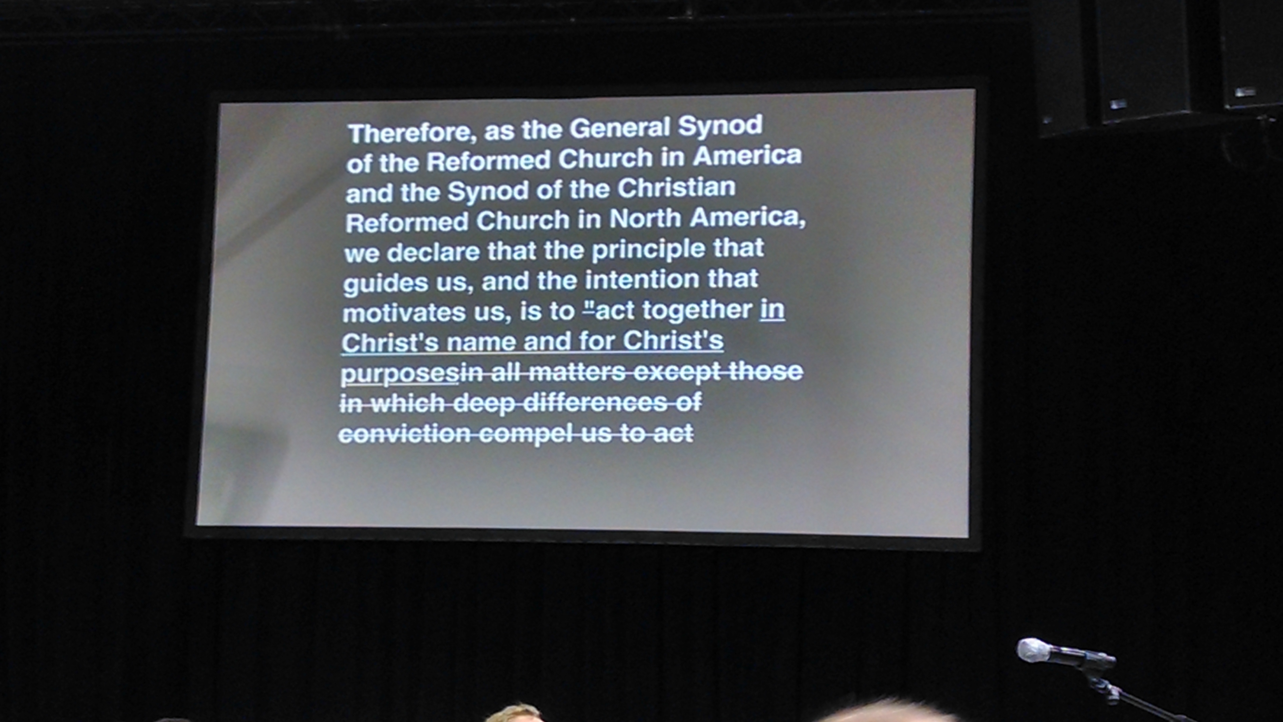 Therefore, as the General Synod of the Reformed Church in America and the Synod of the Christian Reformed Church in North America, we declare that the principle that guides us, and the intention that motivates us, is to “act together in all matters except those in which deep differences of conviction compel [us] to act separately”; and, further, We jointly instruct the Board of Trustees of the Christian Reformed Church and the General Synod Council of the Reformed Church in America, in looking to the future relationship between our two denominations, to be guided by this principle.