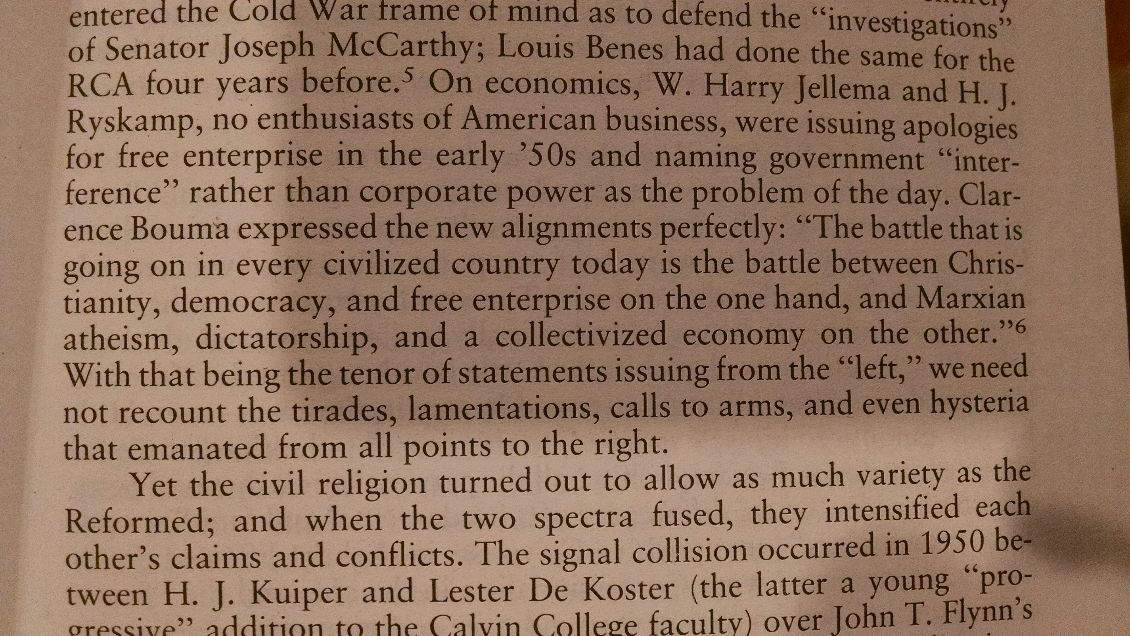 After my post on Saturday I reread the last two chapters of James Bratt’s history of Dutch Calvinism in Modern America. He leaves off his history in the 1970s, about the time when I became old enough to have some awareness of the CRC in New Jersey and the trends underway. Prior to “the big one” CRC factions were shaped by fault lines in the immigrant communities. As the United States went from isolation to empire through the Second World War so the CRC likewise had to get on board with agendas bigger than her own. Her youth fought for the Americans around the world. Television and magazines helped to shape a national culture and a national conversation. (Check out George Marsden’s book on American Cultural changes in the 50s and 60s.) The broader cold war changed the CRC in ways she didn’t realize at the time.