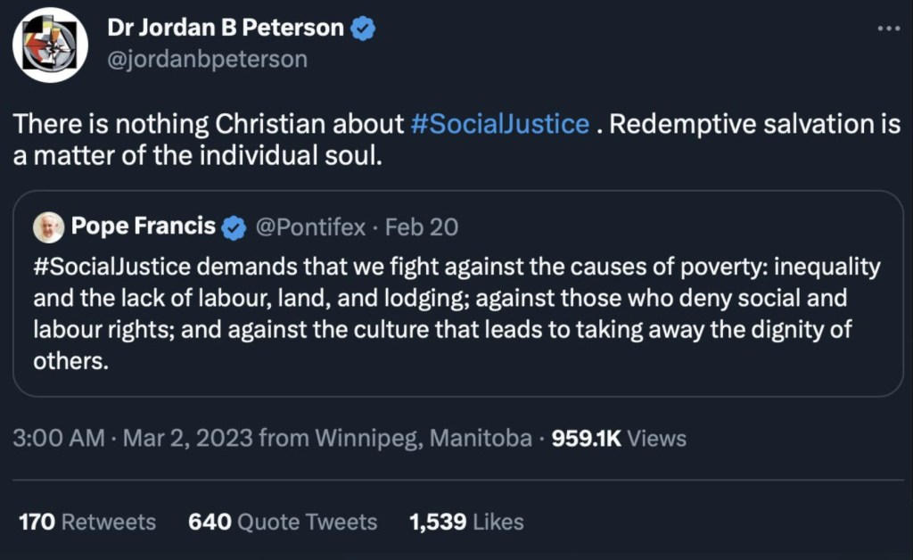 "Authentic social justice" is not antithetical to Christianity. First, yes it is, because it is predicated on group rather than individual categorization; second, we see damn little of "authentic" social justice @Pontifex and a lot of ideology https://t.co/QzuSN3hgHE